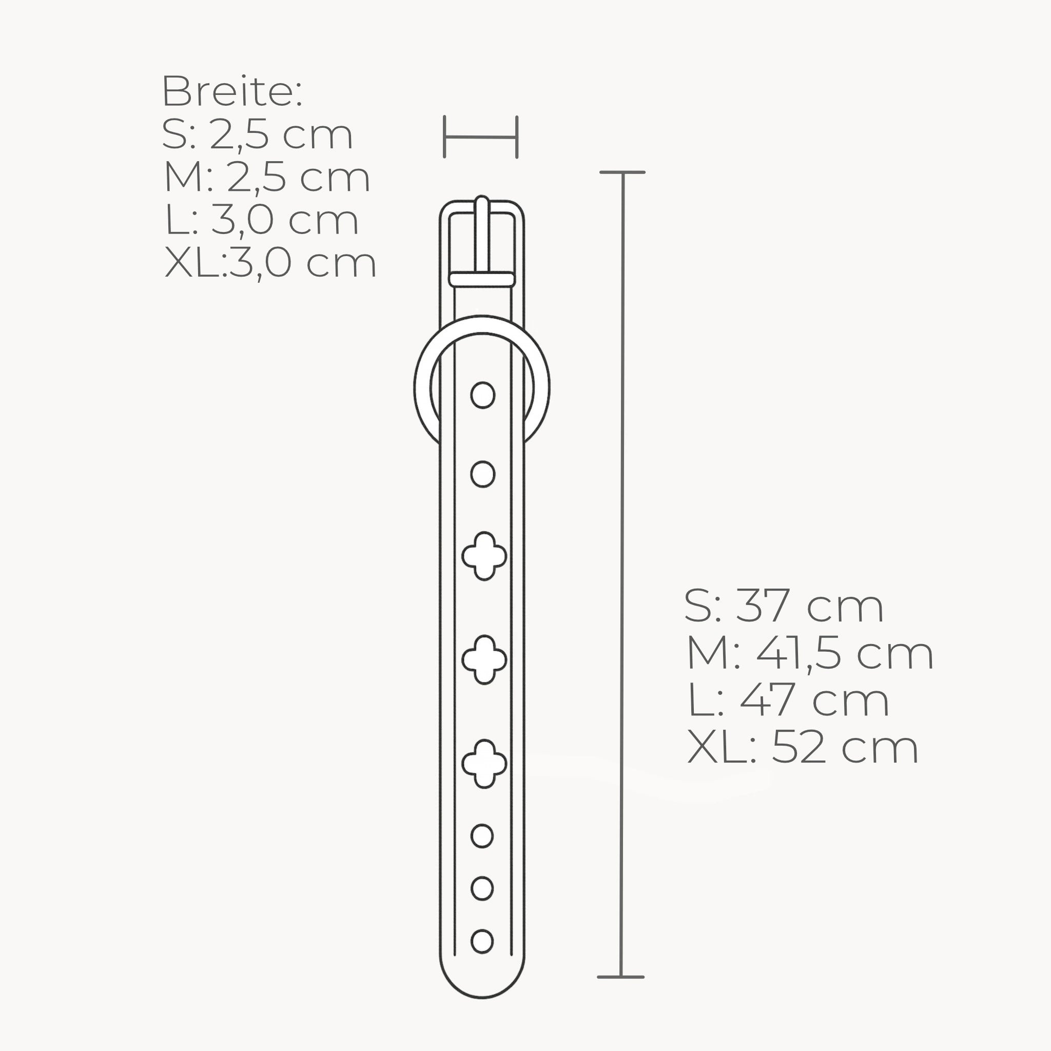 Dank der vier erhältlichen Größen (S–XL) passt das Halsband vielen verschiedenen Hunderassen, von zierlichen bis hin zu kräftigen Hunden. Durch die Breite von 2,5 bis 3 cm liegt es angenehm an und verteilt den Druck gleichmäßig. Das verwendete Leder stammt aus italienischer Produktion und wird wegen seiner Strapazierfähigkeit und geschmeidigen Oberfläche geschätzt.
